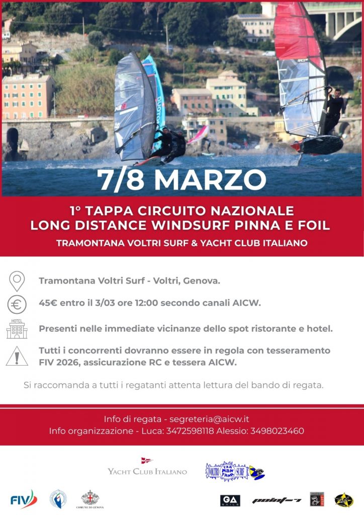 Tramontana Surf Voltri A.S.D., in collaborazione con lo Yacht Club Italiano, Circolo Surf Torbole, Talamone TWKC (su delega della FIV -Federazione Italiana Vela- e in collaborazione con A.I.C.W.) BANDO DI REGATA CIRCUITO ITALIANO LONG DISTANCE 2026 COMITATO ORGANIZZATORE e DATE: TAPPA-Tramontana surf Voltri (GE) 7-8 Marzo 2026 (con eventuale recupero […]